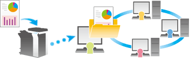 This function converts original data scanned by this machine into a file supported by a computer, and sends it to a shared folder of a computer or server. It also sends a file to your computer as well as to a file server that is usually used to transfer files, which enables sharing of the file between computers.