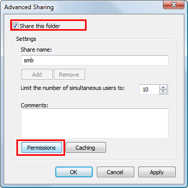 Select the [Share this folder] check box, then click [Permissions].