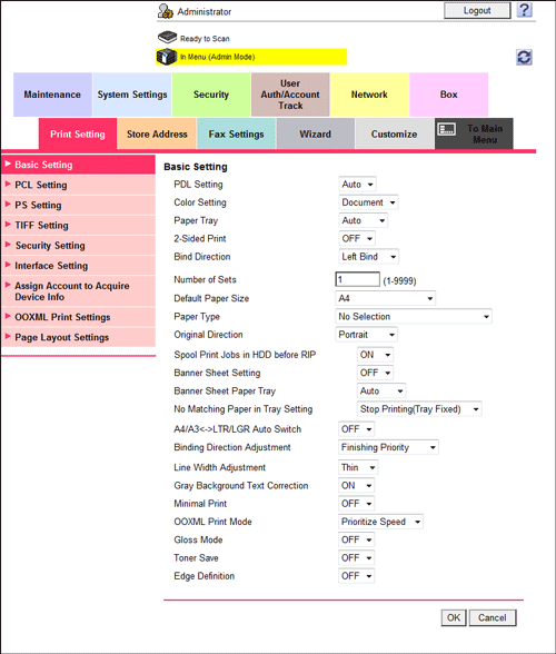 In the administrator mode, select [Print Setting] - [Basic Setting], then configure the following settings.