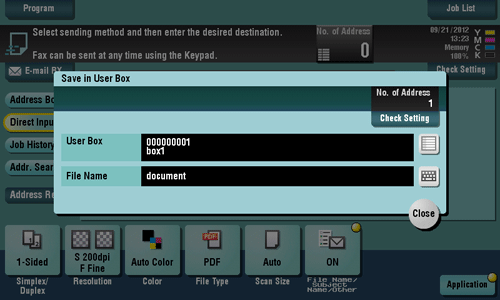 Select a user box to save scanned original data in the user box of this machine. If necessary, change the file name to save it.