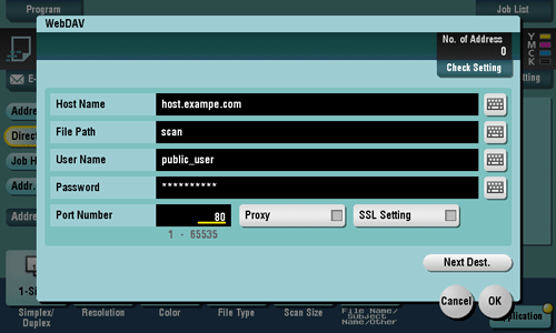Enter a destination WebDAV server host name or IP address when scanned original data is sent to a WebDAV server.