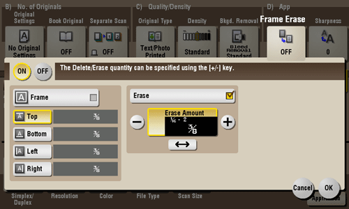 [Frame] | Select this option to erase the four sides of the original to the same width. In [Erase Amount], tap [+]/[-] for the inch area, tap [+]/[-] or Keypad for the centimeter area to specify the width of the area to be erased. To display the Keypad, tap the input area for the numeral. |