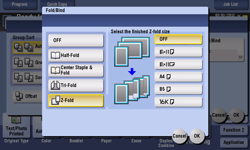 To use the Z-Fold function, the Finisher FS-535 and Z Folding Unit ZU-606 are required (only for bizhub C554e).