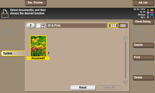 When you print a document from the PC in the user authentication system environment, the files transferred with the ID & Print function are stored in the ID & Print User Box. When a user who has sent the print data logs in to this machine and opens the User Box, he/she can preview, print out, or delete the stored file.