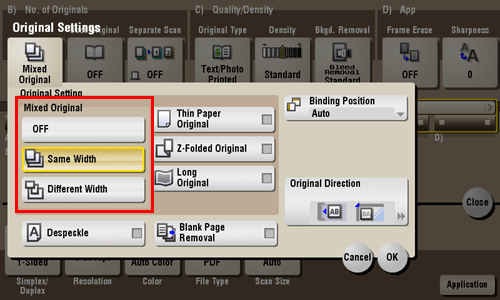 Even for an original with pages of different sizes, by using the ADF, you can scan data while detecting the size of each page. If the widths of the originals are the same, select [Same Width]. If the widths of the originals are different, select [Different Width].