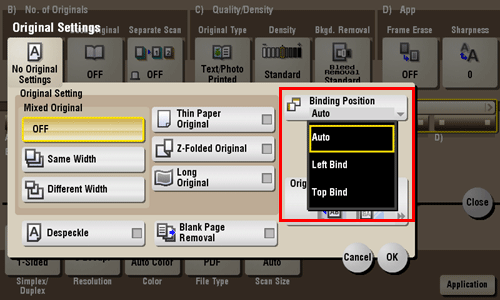 Automatically configures the binding position of the original. When the long side of the original is 11-11/16 inches (297 mm) or less, the binding position is set to the long side of the paper. When the long side of the original exceeds 11-11/16 inches (297 mm), the binding position is set to the short side of the paper.