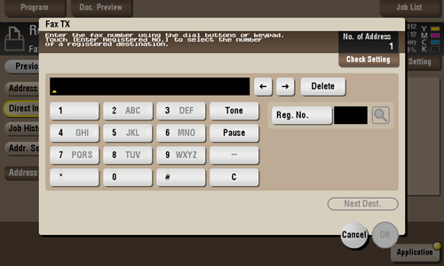 Tapping [Reg. No.] allows you to specify a fax destination by a registered number.