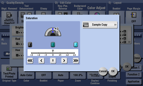 [Sample Copy] | You can check the finishing by printing a sample copy. Place the original on the Original Glass, and tap [OK] or press Start. |