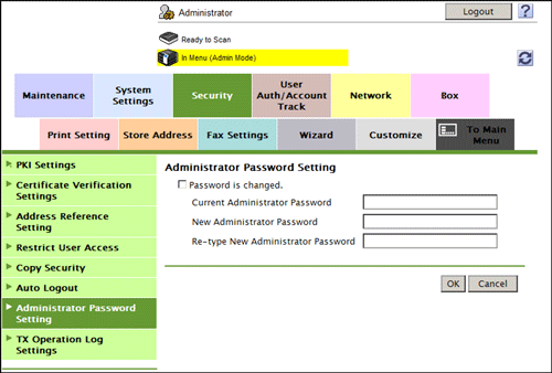 1. In the administrator mode, select [Security] - [Administrator Password Setting], and enter a new administrator password (using up to 64 characters, excluding ").
