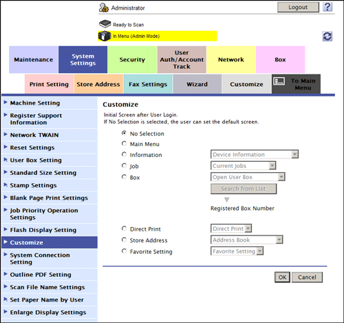 In the administrator mode, select [System Settings] - [Customize], then configure the following settings.