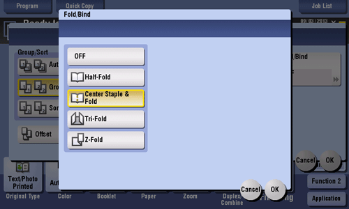 • [Center Staple & Fold]: Staples and feeds out a copied sheet by folding it in two.