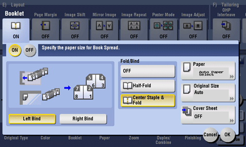 • You can simplify the setting operation by automatically enabling the Booklet function when the setting screen for [Booklet] is displayed. (Default: [OFF]) For details, refer to Here.