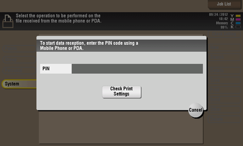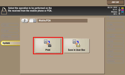You can also print files by selecting the User Box operation mode and by tapping [System] - [External Memory].