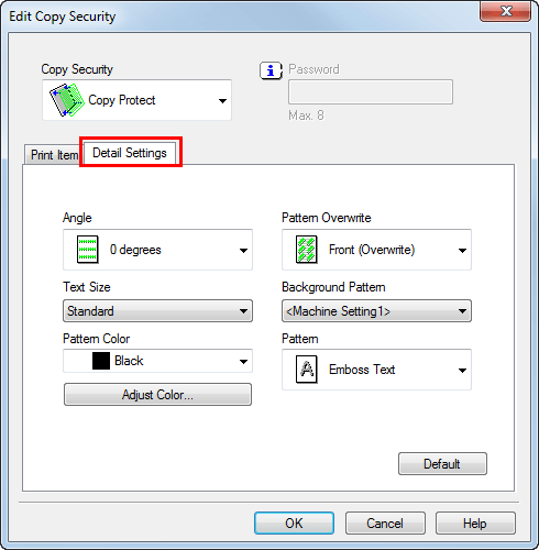 Select whether the text pattern is embossed or outlined when the original is subjected to unauthorized copying.