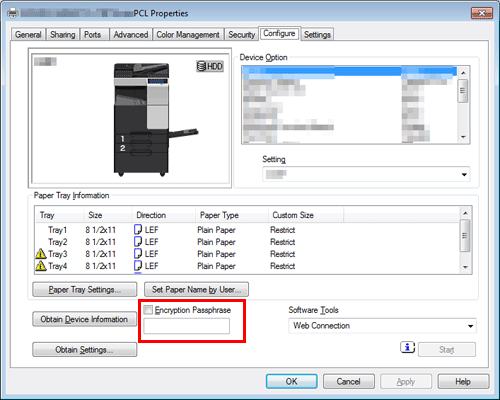 • If OpenAPI communication is SSL-encrypted and the device information can be automatically obtained from the printer driver, the encrypted passphrase can be obtained from this machine. For details on how to encrypt OpenAPI communication with SSL, refer to Here.