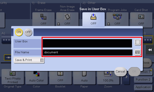 Select [Application] - [Other] to set [Save in User Box] to [ON], and tap the input area or the list icon of the [User Box].