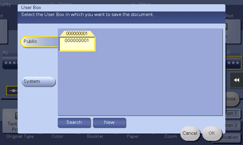 To save the original to a Public User Box, a Personal User Box, or a Group User Box, tap [Public], [Personal], or [Group] and select the destination user box. Tap [New] and enter a new user box number to register the destination user box.