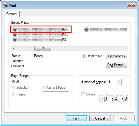 2. Check that the fax driver of this machine is selected in [Printer Name] (or [Select Printer]).
