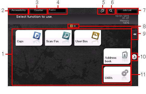 1 | Main menu keys | Display shortcut keys assigned to any function. Shortcut keys can be customized freely to suit your requirements. By default, [Copy], [Scan/Fax], [User Box], [Address book], and [Utility] are arranged on the main menu. ([Utility] is fixed.)