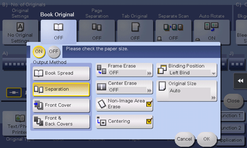 • [Separation]: Copy the right and left pages of two-page spreads separately in the order of the page numbers.