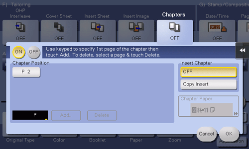 [Chapter Paper] | If [Insert Chapter] is set to [Copy Insert], select the paper tray where the Chapter Paper is stacked. If the chapter paper and text paper differ, use the same size of paper and stack them in the correct direction. |