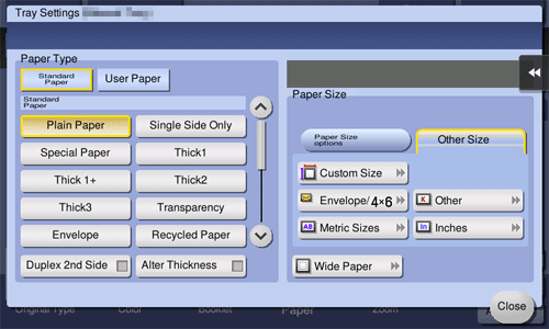 Select the paper size and type for copying. You can also change the size and type settings of the paper loaded in paper trays.