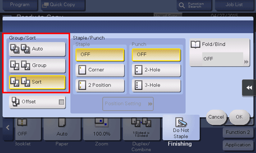 Automatically switches between Sort and Group according to the number of printed sheets for each set, and feeds out. If the number of printed sheets for each set is 1, the Group function is applied. If the number is 2 or larger, the Sort function is applied.