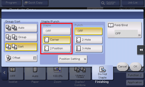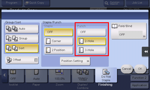 Select the punch position and original loading direction. If [Auto] is specified for the punch position, the punch position is determined automatically based on the direction of the loaded original.