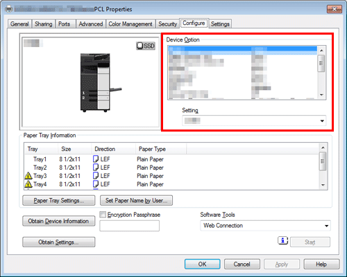 If the [Auto] of [Obtain Settings...] is disabled and if you click [Obtain Device Information], the current information of this machine is obtained and reflected on the [Device Option].