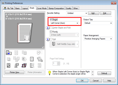 In the [Finish] tab, select the [Staple] check box. In addition, specify the number and positions of staples.