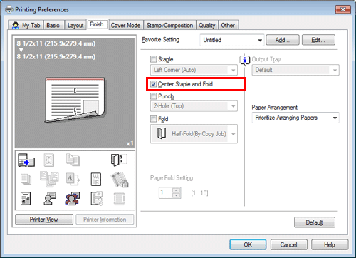 In the [Finish] tab, select the [Center Staple and Fold] check box.