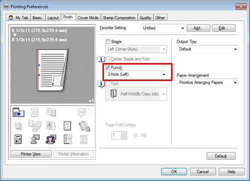 In the [Finish] tab, select the [Punch] check box. In addition, specify the number and positions of punch holes.