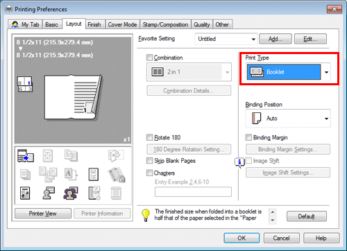 In [Print Type] in the [Layout] tab, select [Booklet].
