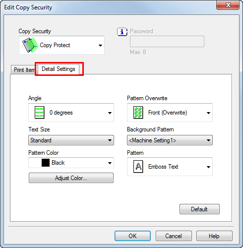 In the [Stamp/Composition] tab, select the [Copy Security] check box, and then select [Password Copy].