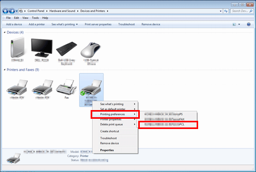 In Windows Server 2008, right-click the icon of the installed printer, then click [Printing Preferences...].