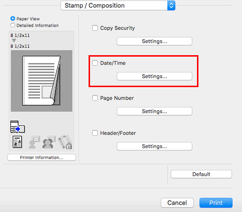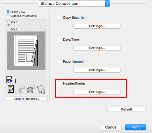 In [Stamp / Composition], select the [Header/Footer] check box, then click [Settings...].