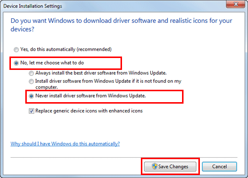Select [No, let me choose what to do], select [Never install driver software from Windows Update.], then click [Save Changes].