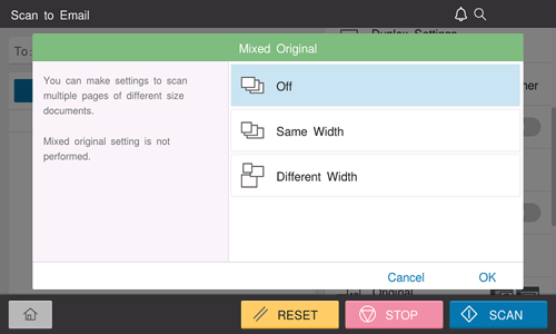 Even for an original with pages of different sizes, by using the ADF, you can scan data while detecting the size of each page. If the widths of the originals are the same, select [Same Width]. If the widths of the originals are different, select [Different Width].