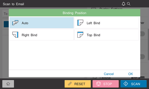 [Binding Position] | When scanning both sides of the original, select the original binding position to prevent the binding positions from being reversed between the front and rear faces.