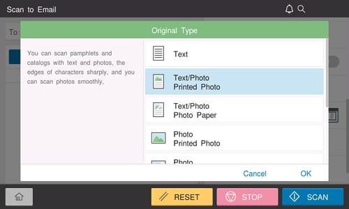 [Photo Photo Paper] | Scans an original consisting of only photos at the optimum image quality level. Select this option to scan originals printed on photographic paper. |
