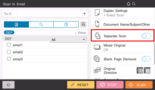 [Page Separation] | When you want to separate a file for each page while the original consists of multiple pages, set [Page Separation] to ON. This is not available when [File Type] is set to [JPEG]. All pages are separated. |