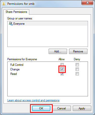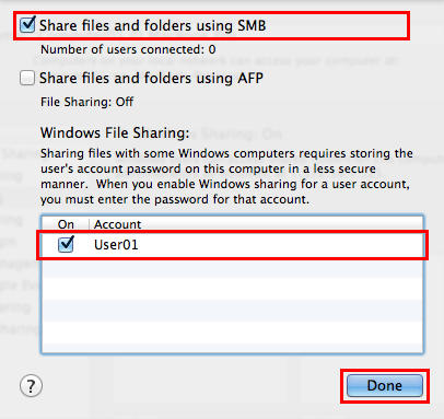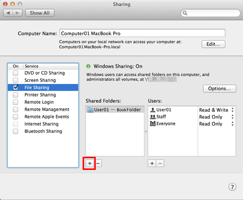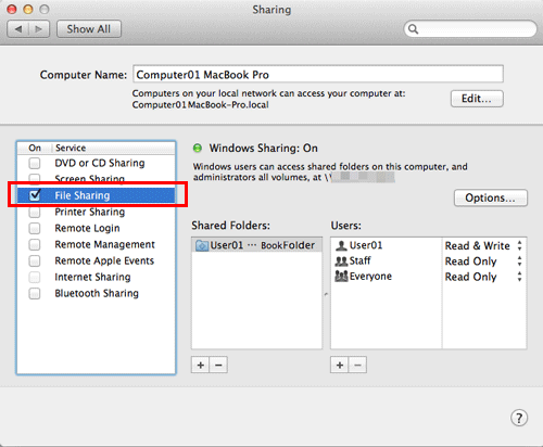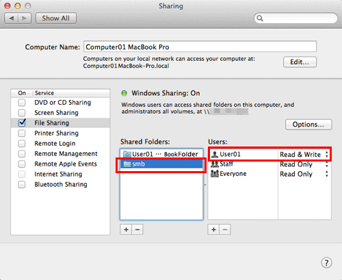 Click [Options], and select the [Share files and folders using SMB]. Then, select the log-in user name (displayed name) check box.