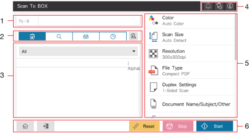 If you tap [Scan to Box] on the home screen, the basic screen of Save in User Box is displayed.