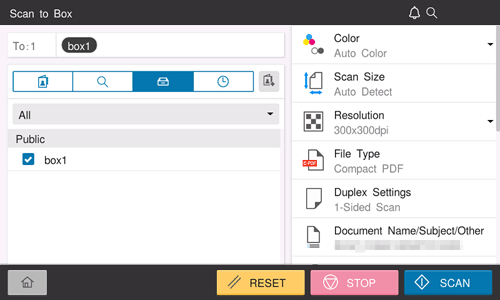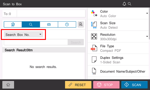 When [User Box List] is selected in step 1, select [Search Box Name] or [Search Box No.] as the search method, and enter the target User Box name or User Box number.