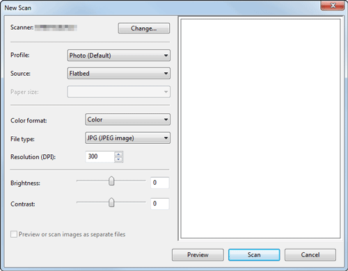 If you select [Flatbed] in [Source], click [Preview] before saving data as a file, and check the image of the scanned original.