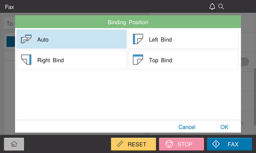 [Auto] | Automatically configures the binding position of the original. When the long side of the original is 11-11/16 inches (297 mm) or less, the binding position is set to the long side of the paper. When the long side of the original exceeds 11-11/16 inches (297 mm), the binding position is set to the short side of the paper. |