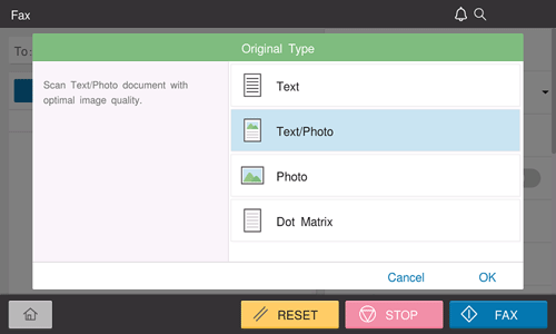 [Dot Matrix] | Scans an original, which consists primarily of text such as thin or faint characters, at the optimum image quality level. This function reproduces text using high pixel density, creating easy-to-read text. |