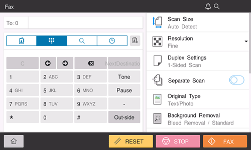 [Out-side]: Insert an outside line number ([E-] is displayed) when connecting this machine to PBX (private branch exchange). This option is displayed when [PBX Connection Setting] (Here) is set.