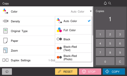 [Auto Color] | Makes copies with color settings to suit the colors of the scanned original. |