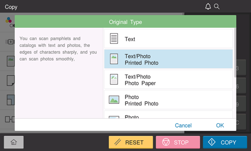 [Text/Photo - Printed Photo] | Copies the original, which consists of text and photos, at the optimum level of image quality. This function sharpens the edges of each character and reproduces smoother photos. Select this option to scan printed originals such as brochures and catalogs. |